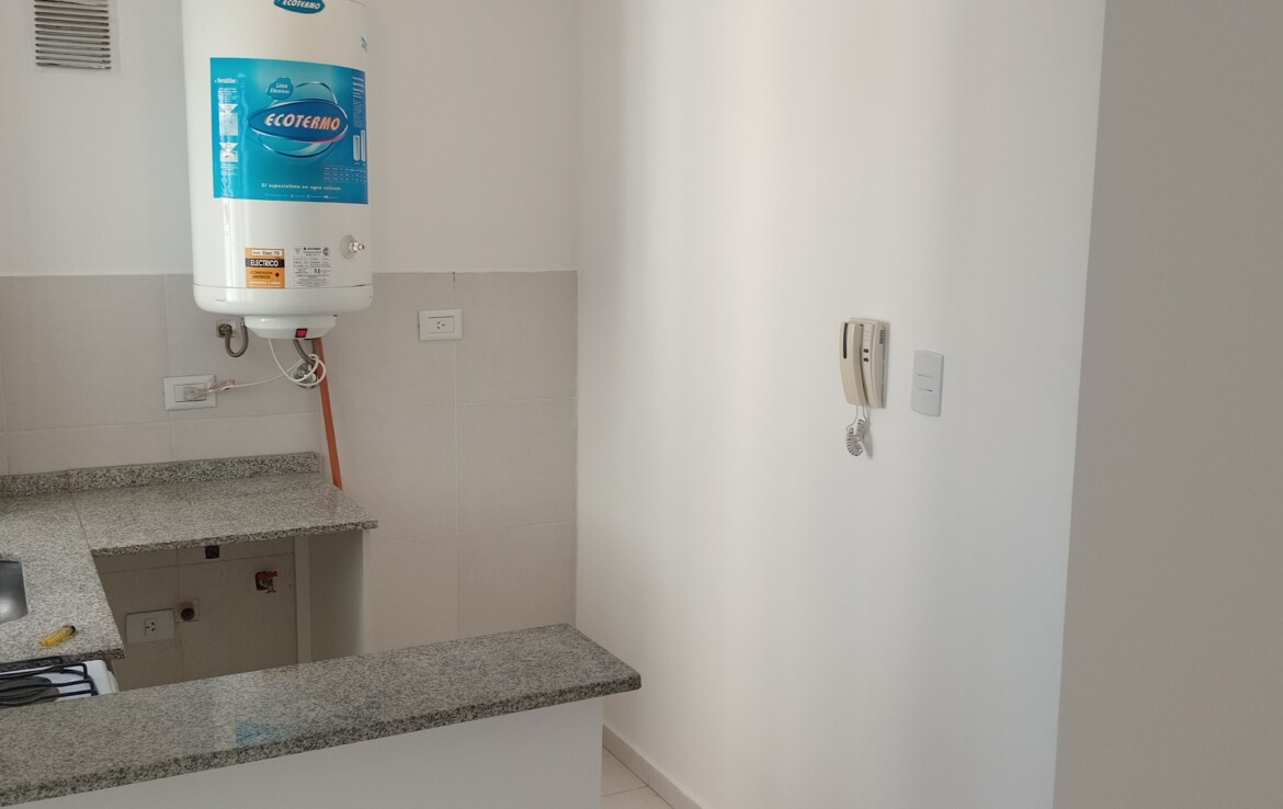 -Cocina integrada con mueble de bajo mesada de melamina blanca en perfecto estado, desayunador, artefacto de cocina, conexión para lavarropas y ventilación natural