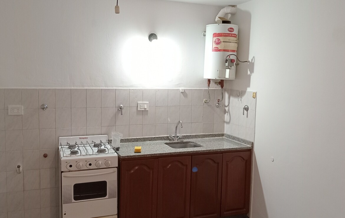 -Cocina integrada tipo kitchenette con mueble de bajo mesada en buen estado, artefacto de cocina y conexión para lavarropas