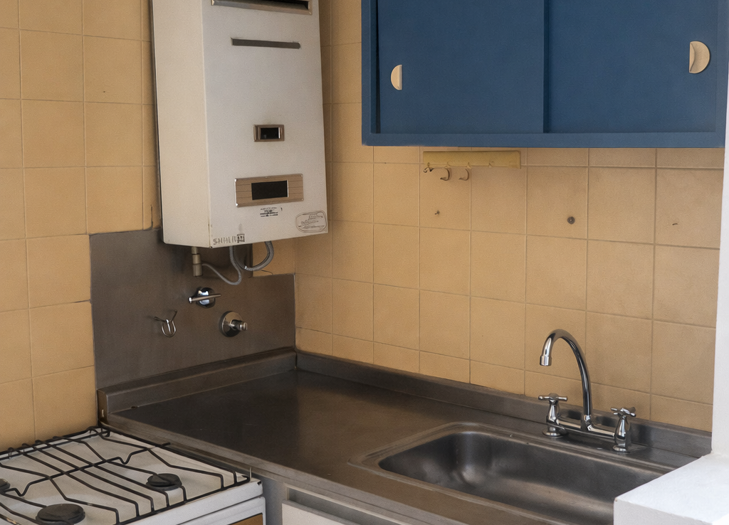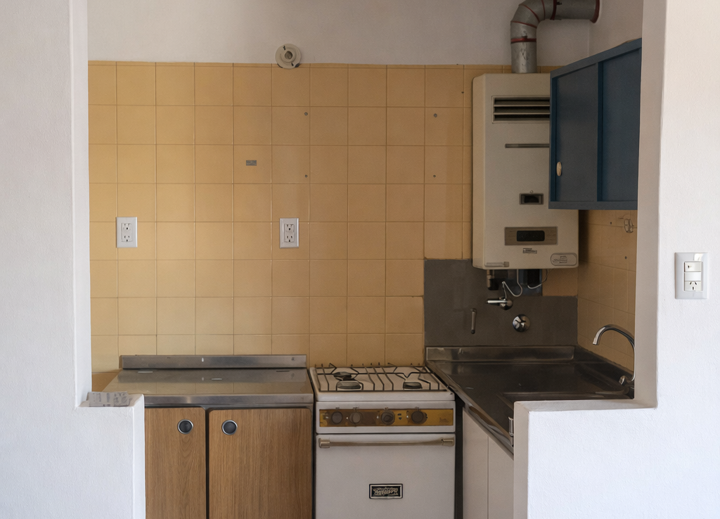 -Cocina semi integrada con mueble bajo y sobre mesada en buen estado, artefacto de cocina y conexión para lavarropas