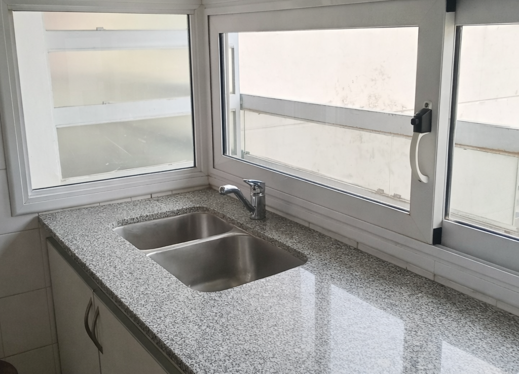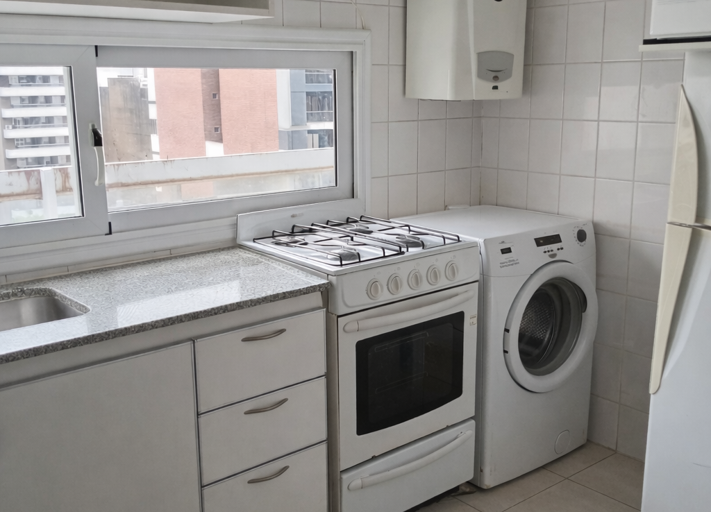 -Cocina separada con mueble bajo mesada y alacena impecables, artefacto de cocina, heladera, lavarropas y ventilación natural