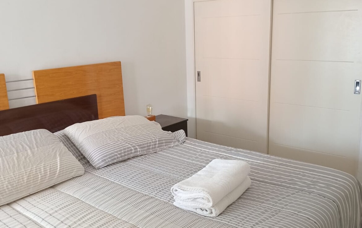 -Dormitorio con placard empotrado, cama y mesas de luz. Salida al balcón