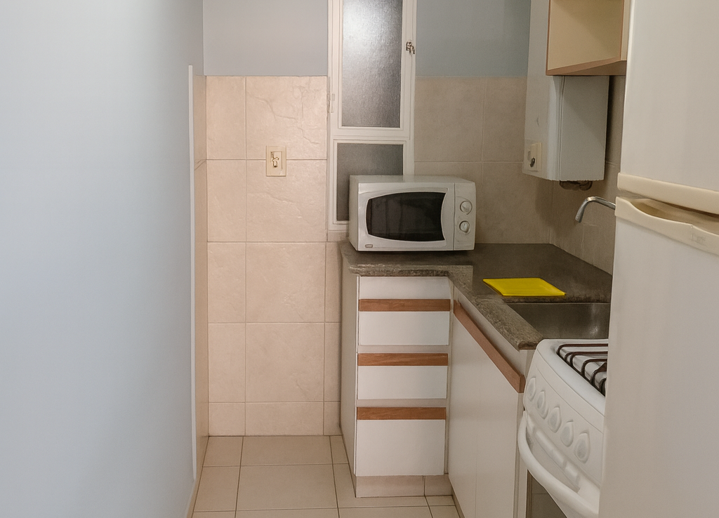 -Cocina integrada con mueble de bajo y sobre mesada impecables, artefacto de cocina, heladera y microondas