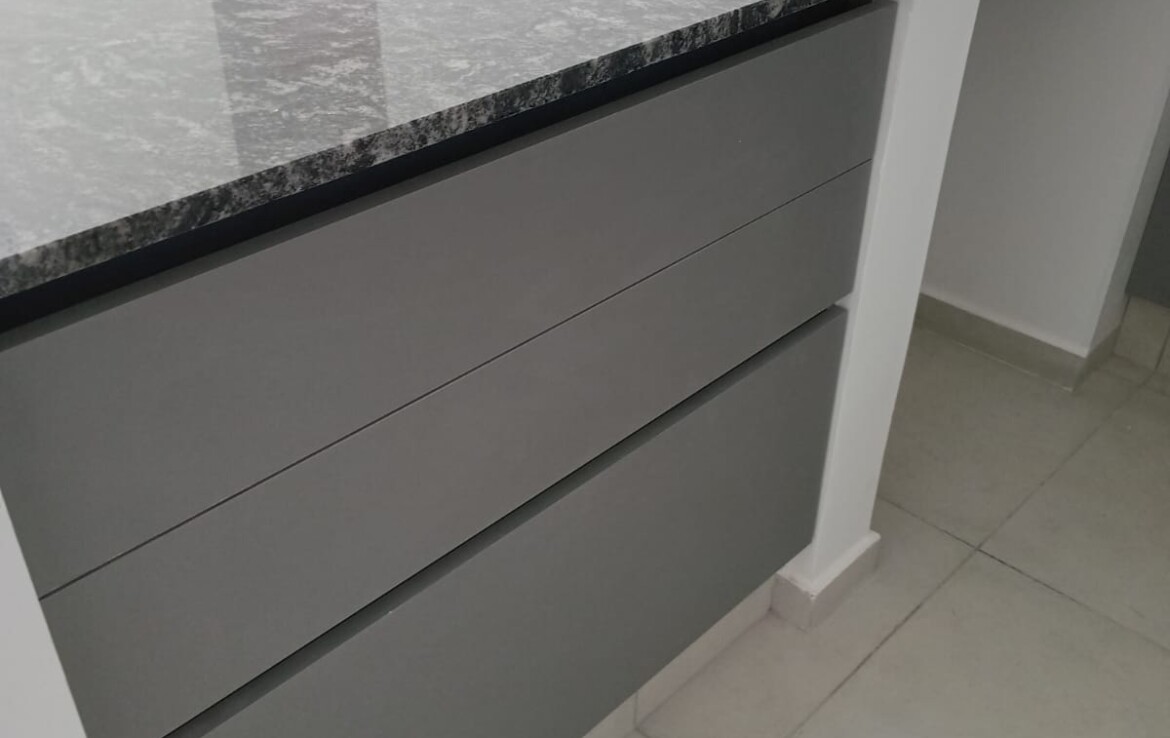 -Cocina integrada tipo kitchenette con mueble de bajo mesada y alacena, desayunador, artefacto de cocina y conexión para lavarropas