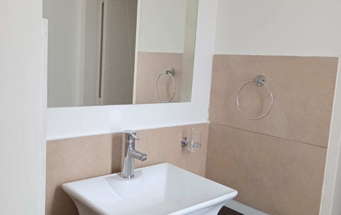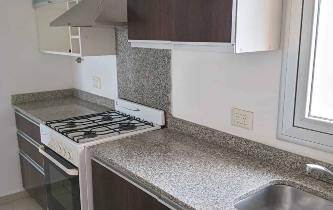 -Cocina integrada tipo kitchenette con barra desayunador, mueble de bajo y sobre mesada impecables, artefacto de cocina y conexión para lavarropas. Buena ventilación.